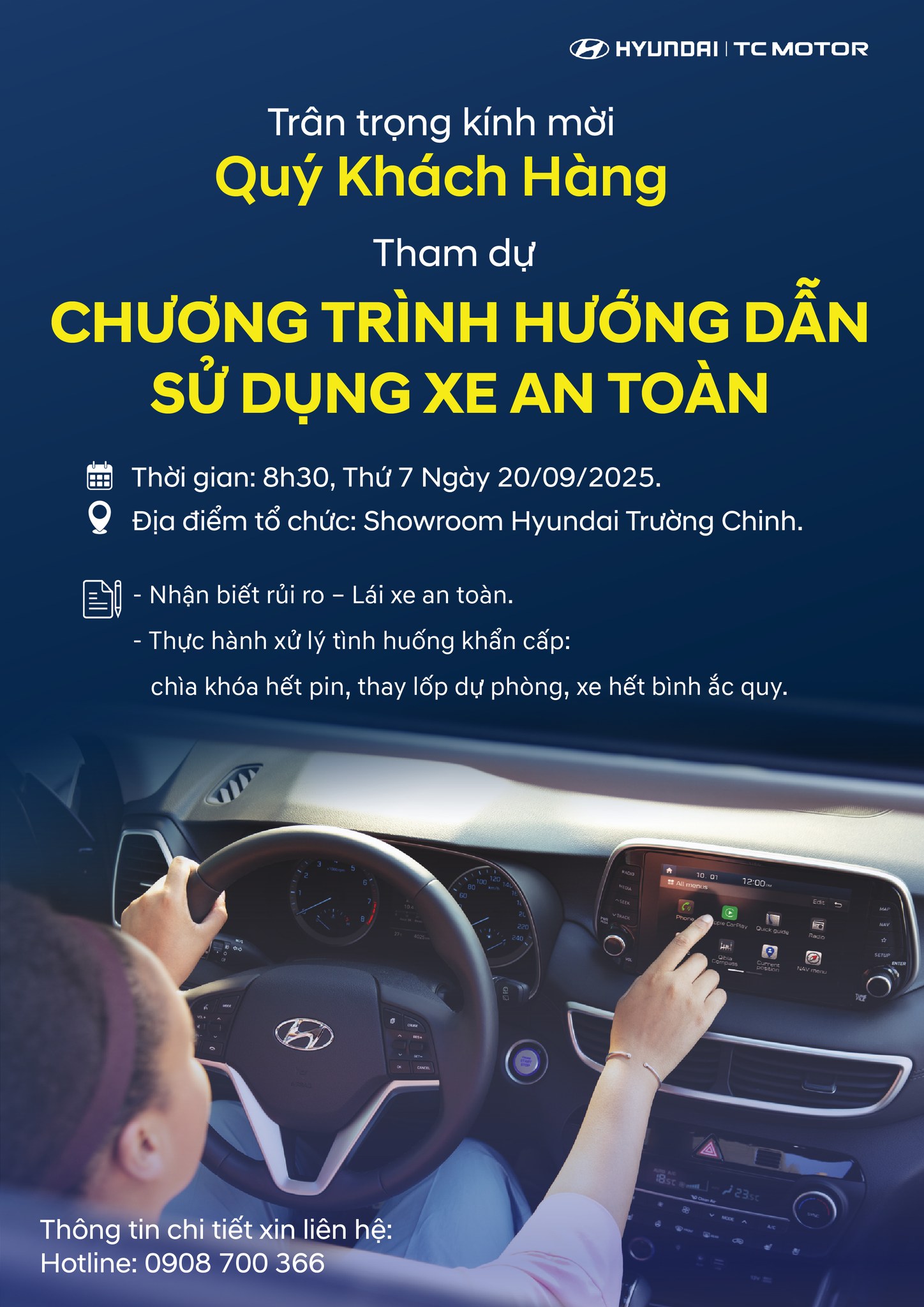 ⏰ Thời gian: 8h30 - Ngày 20/09/2025 (thứ 7) 📍 Địa điểm: Showroom Hyundai Trường Chinh, Số 682A Trường Chinh, Phường Tân Bình, TP.HCM 👥 Đối tượng: Khách hàng đang sử dụng hoặc quan tâm đến xe Hyunda