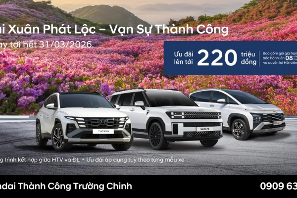 Tháng 3/2026 – Hyundai Thành Công Trường Chinh chính thức công bố chương trình ưu đãi dành cho khách hàng mua xe trong tháng 3/2026, với hai quyền lợi nổi bật: Gia hạn bảo hành lên đến 8 năm hoặc 120.000 km (tùy điều kiện nào đến trước) và Ưu đãi giá bán trực tiếp lên đến 220 triệu đồng cho một số dòng xe Hyundai.