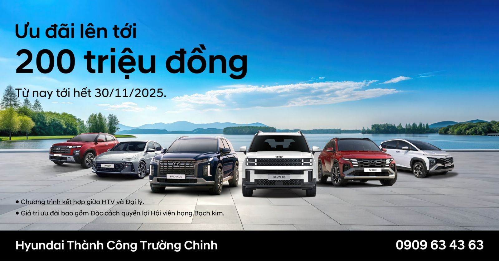 Tháng 11/2025, Hyundai Thành Công Trường Chinh chính thức triển khai chương trình ưu đãi kép hấp dẫn “Bảo hành 8 năm – An tâm vận hành” cùng nhiều hỗ trợ chi phí sở hữu khác cho các mẫu xe Palisade, Santa Fe, Tucson, Creta, Accent, Stargazer và Grand i10.