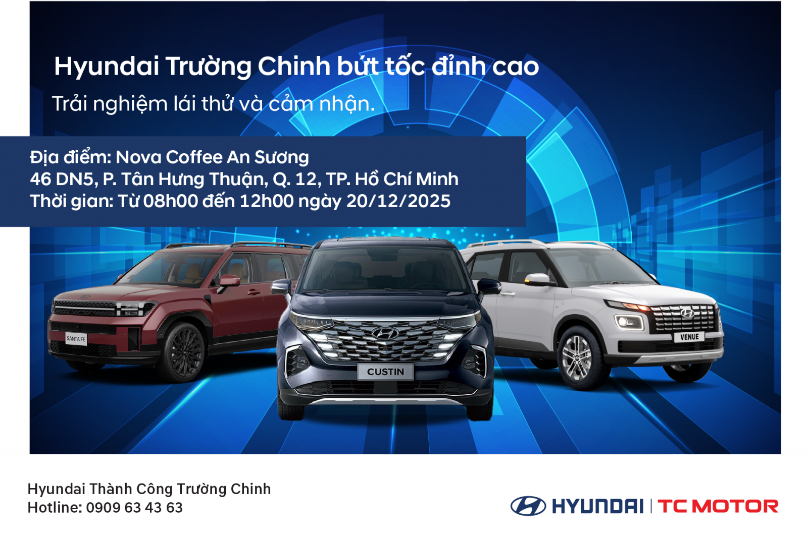 🔥 THÔNG TIN SỰ KIỆN 📍 Địa điểm: NOVA COFFEE AN SƯƠNG - 46 DN5, P. Tân Hưng Thuận, Q. 12, TP. Hồ Chí Minh 🗓 Thời gian: 8h – 12h, ngày 20/12/2025 🚗 Xe lái thử: Santa Fe, Custin, Venue