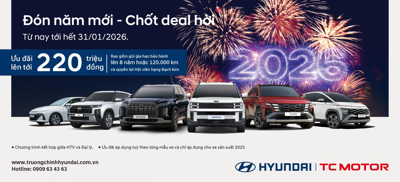 Tháng 1/2026 – Hyundai Thành Công Trường Chinh chính thức khởi động chuỗi ưu đãi toàn diện dành cho khách hàng trong tháng 1/2026. Chương trình với tên gọi “Đón năm mới – Chốt deal hời”, với tổng giá trị ưu đãi lên tới 220 triệu đồng, cùng quyền lợi giá trị khác áp dụng cho các dòng xe Hyundai.